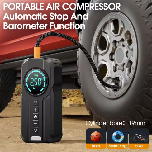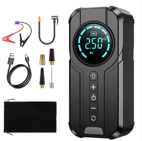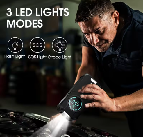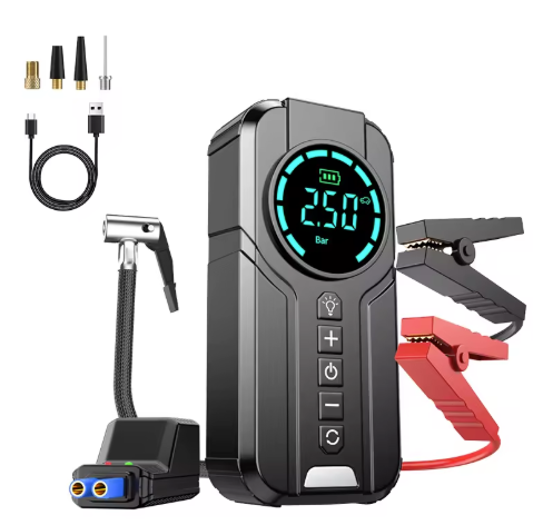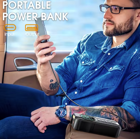 Compact and high-capacity portable power bank for all your devices, Works as a Car Jump Starter in Emergency battery failure situation, Car tire pressure checker and pump. Device also comes with a powerful LED lamp.